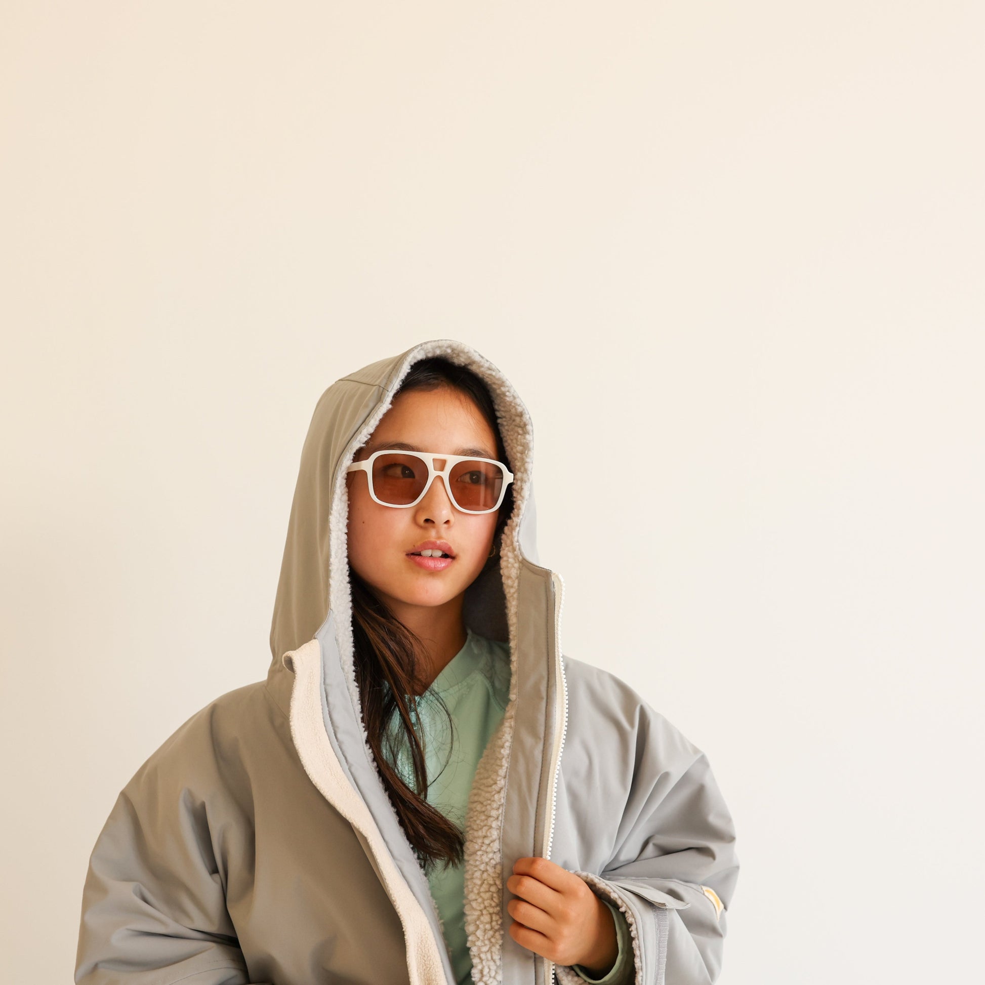 Sherpa lined hood + long sleeves offer full protection to minimise body heat loss.